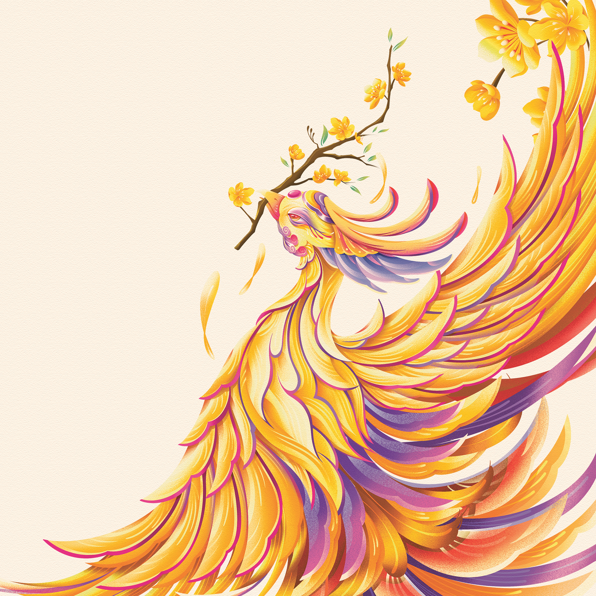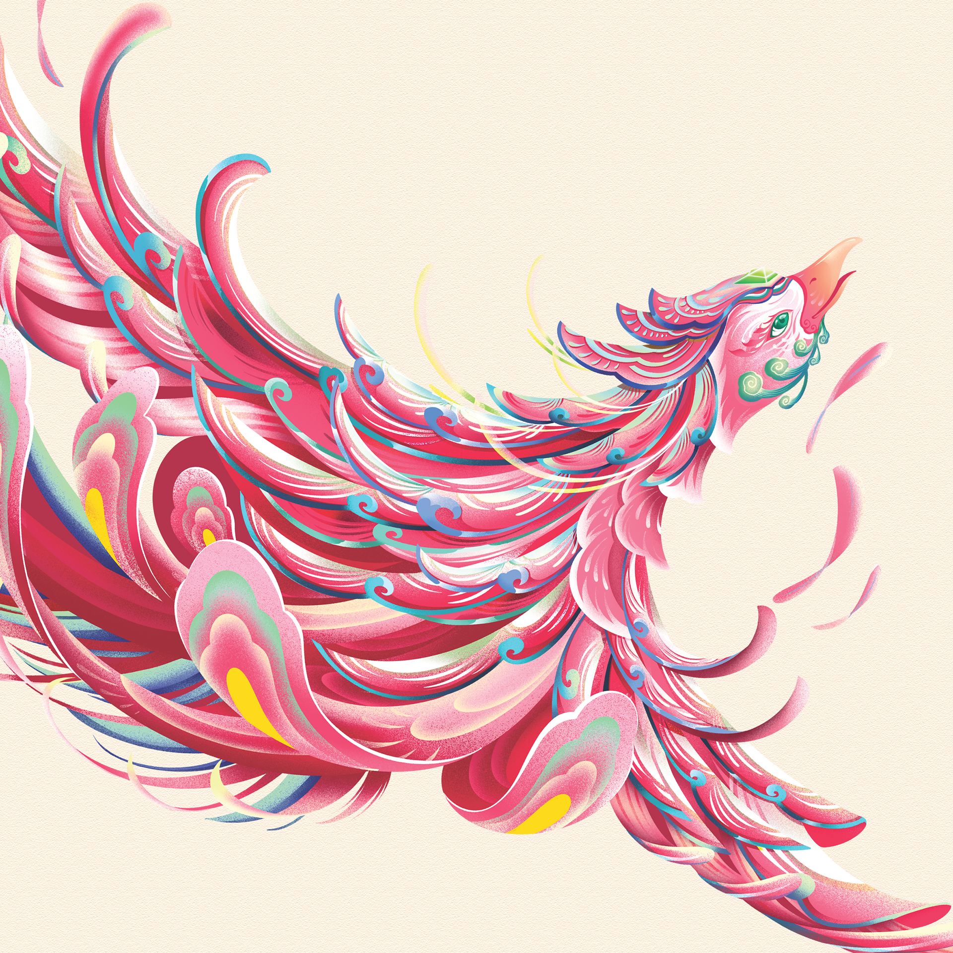 The soft gradation of colors in the phoenix feathers and floral elements keeps the overall composition light and balanced — refined rather than ostentatious — allowing it to resonate naturally with both younger audiences and older generations alike.