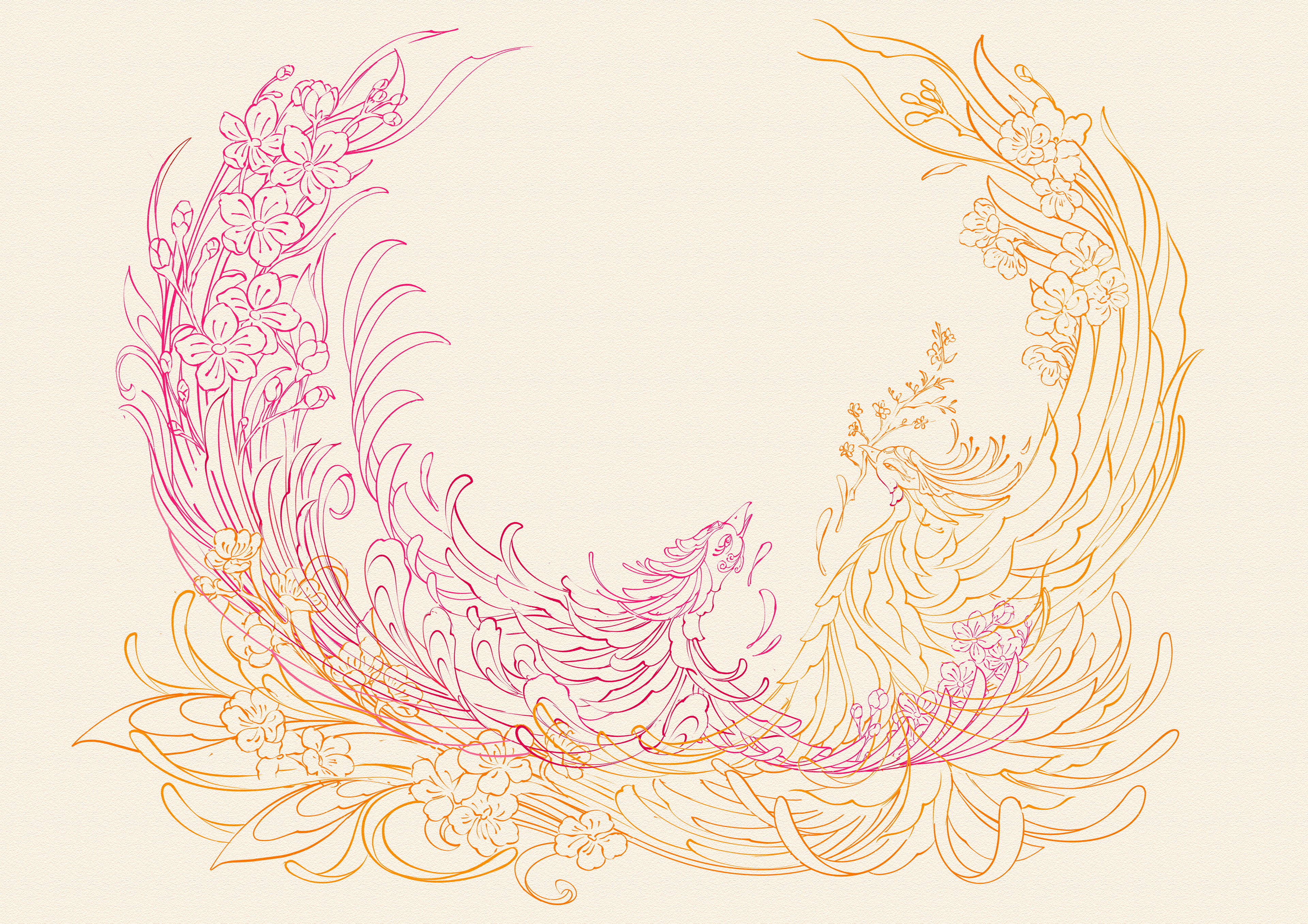 Rather than standing alone, the flowers flow seamlessly into the movement of the phoenixes, creating the sense that spring does not arrive in stillness, but weaves, spreads, and overflows, filling every corner of life with vitality and hope.