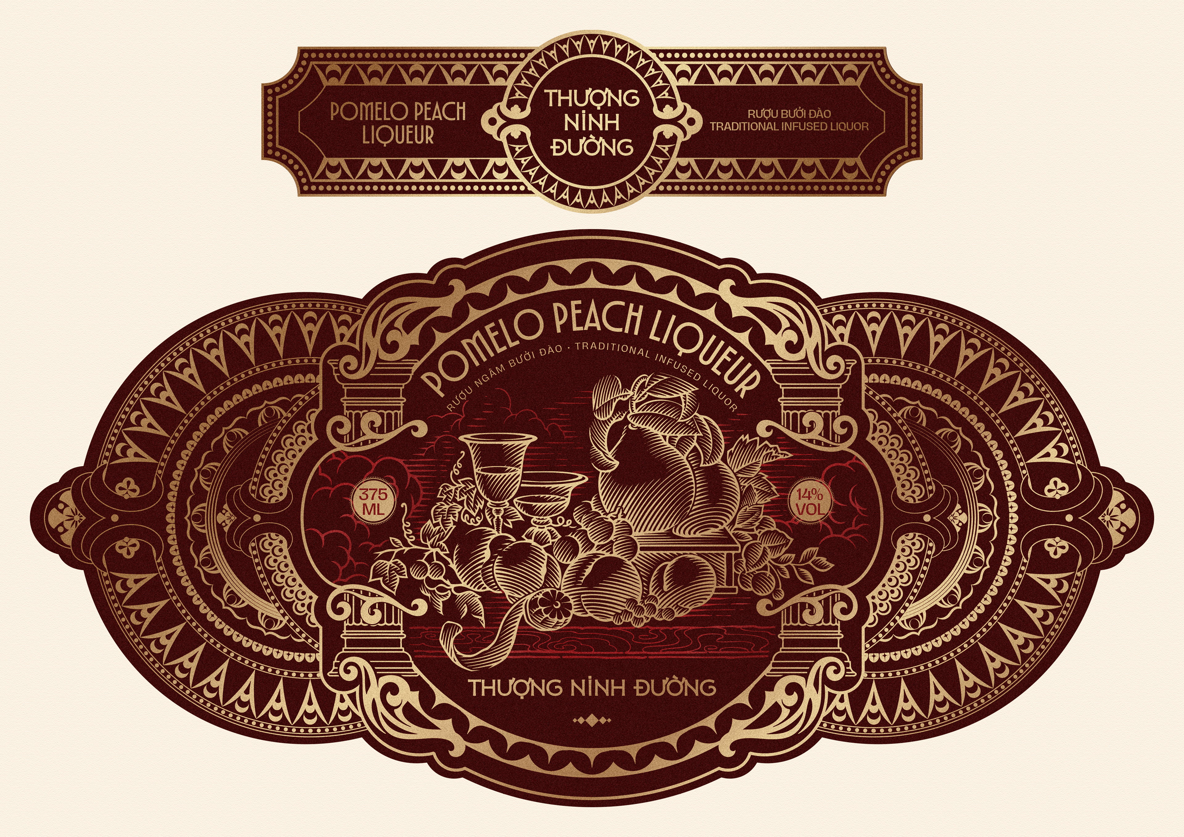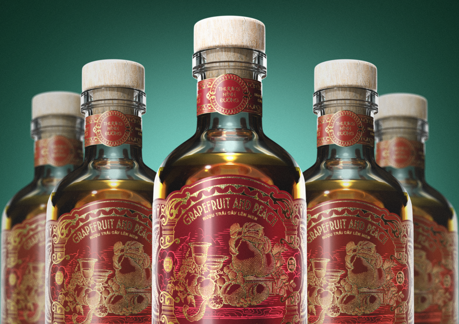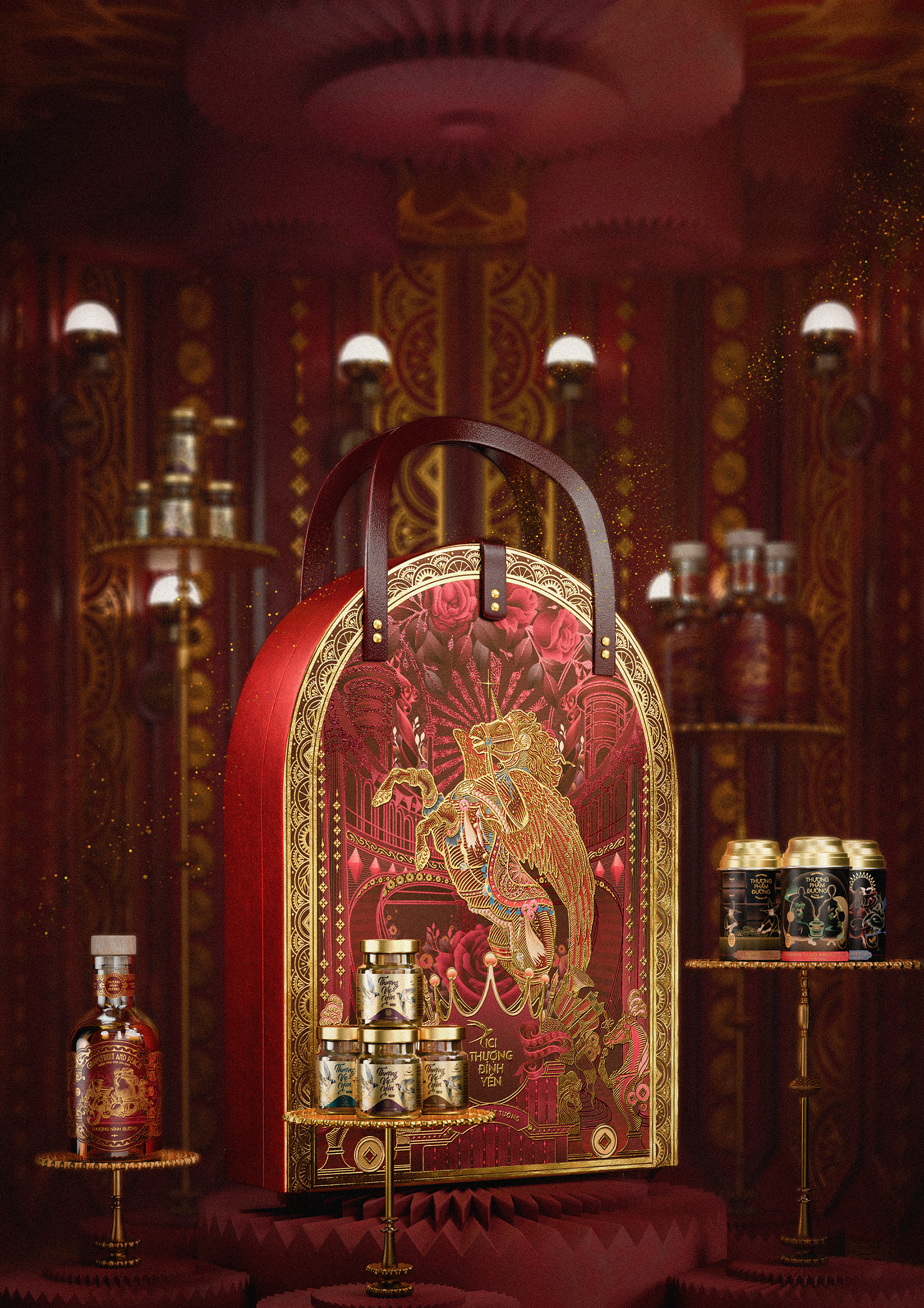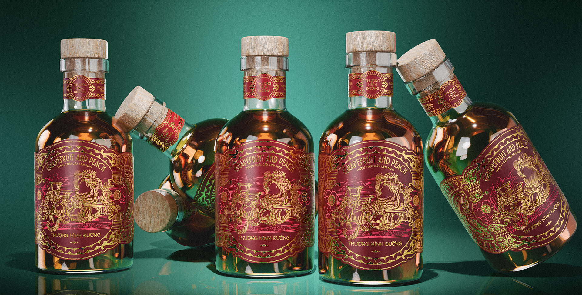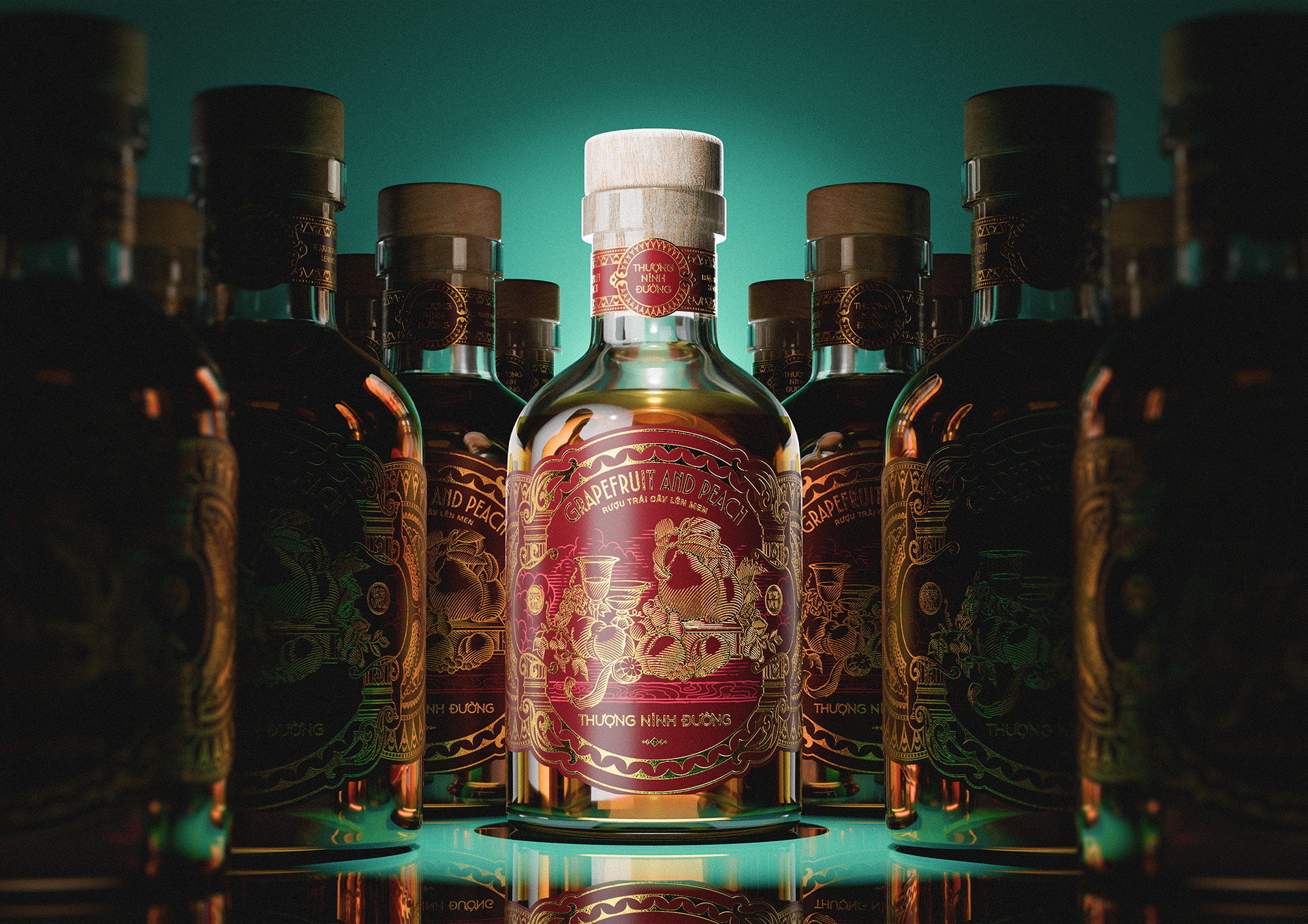 This vintage pomelo and peach liquor, inspired by the heritage of European royalty, ritualizes the elegance of the New Year banquet. Guided by classical symmetry, the design draws all power to the center, where the bottle glows like a shimmering ruby in a majestic, sovereign space.