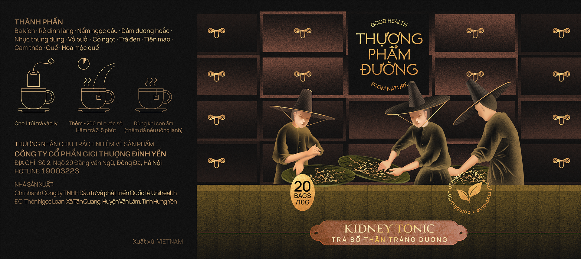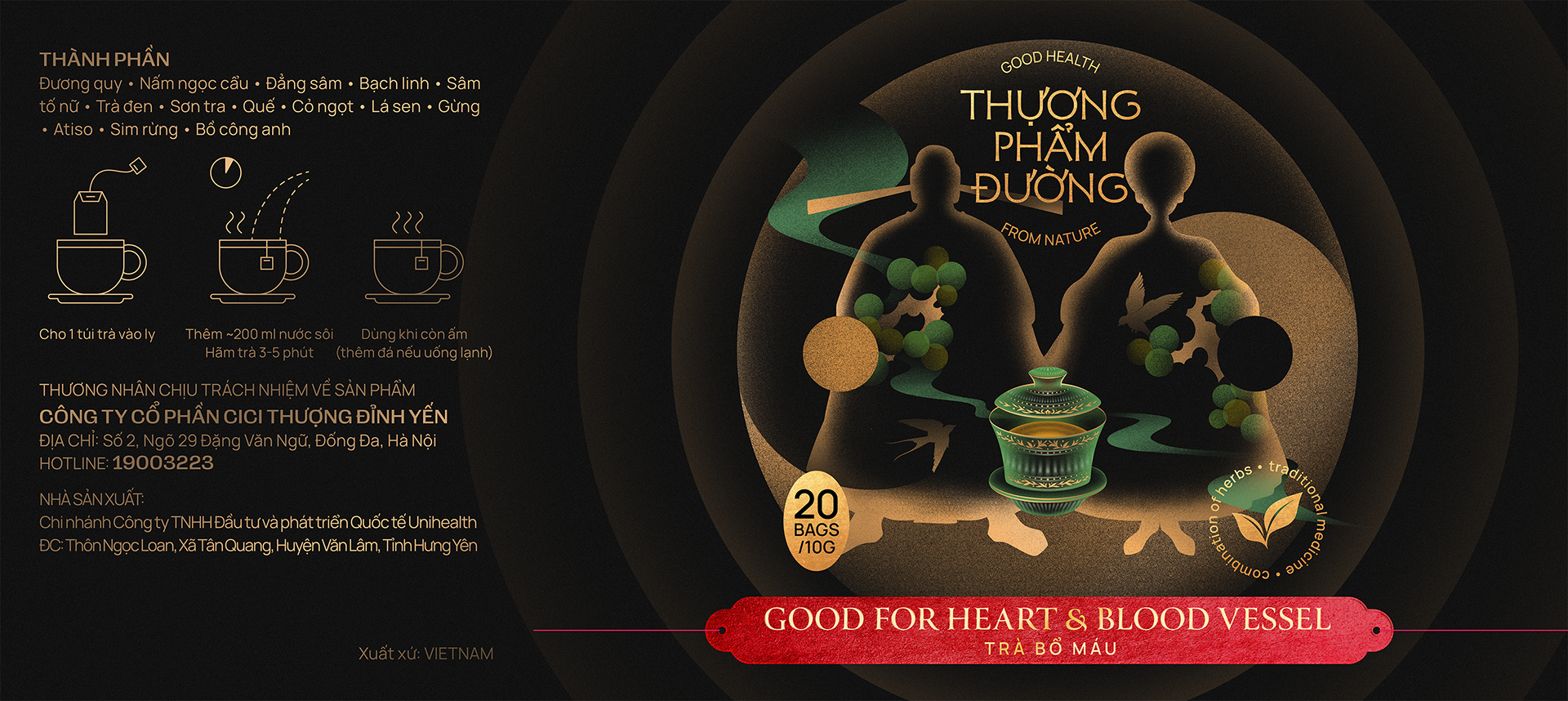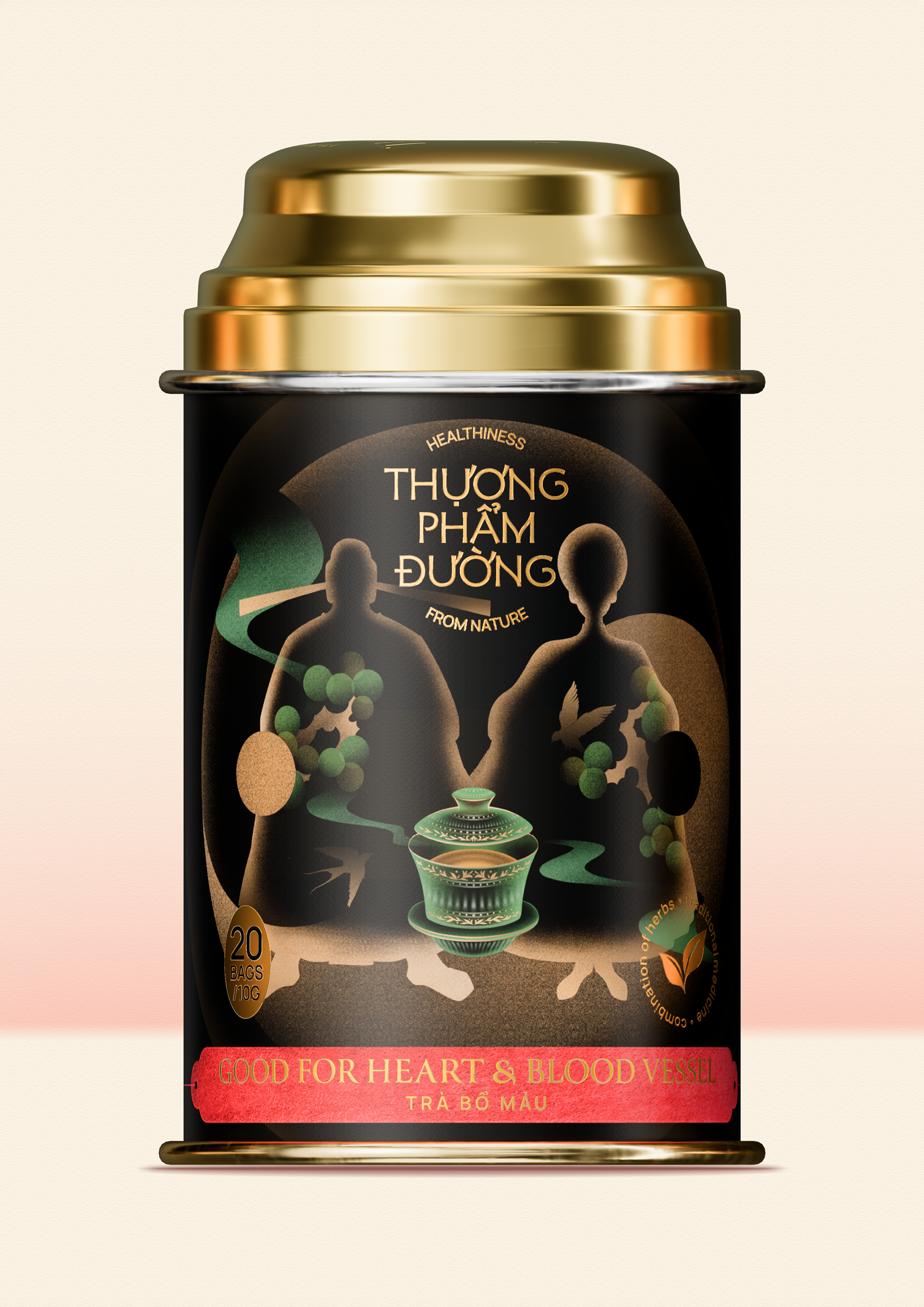 Đây không chỉ là một loại trà, mà là một câu chuyện về thế giới dược liệu Á Đông. Bộ ba thiết kế hộp trà Thượng Phẩm Đường không thuần tuý minh họa công dụng trà, mà chuyển hóa dược tính thành hình ảnh nghệ thuật. Khơi gợi sự quen thuộc của người tiêu dùng về thói quen sử dụng trà dưỡng thân, dưỡng tâm, dưỡng khí huyết của người xưa truyền lại.