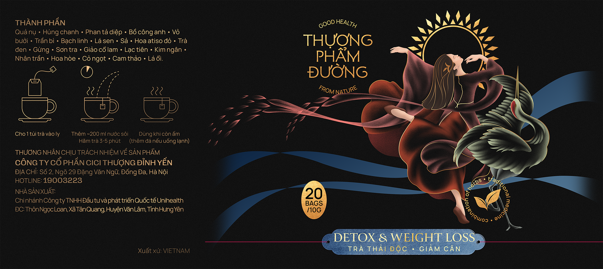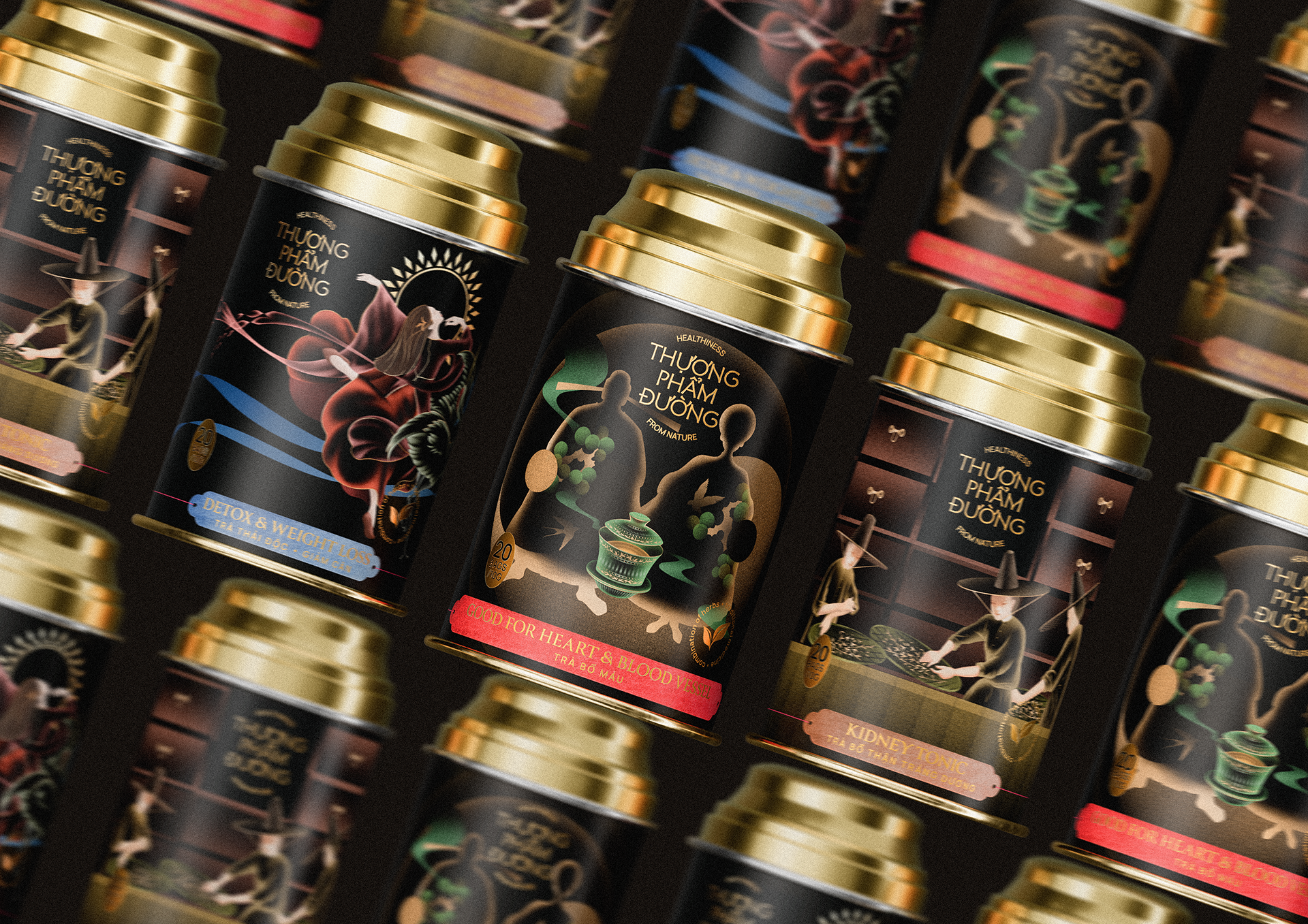 Chuỗi ba sản phẩm được xây dựng như một bộ tranh thống nhất về mỹ thuật cổ truyền Á Đông, trong đó mỗi thiết kế không chỉ mô tả công dụng của trà mà diễn giải chúng bằng ngôn ngữ biểu tượng và triết lý nhân sinh. Tạo nên một hệ thống thống nhất – nhận diện được ngay – không lẫn với bất kỳ dòng trà thương mại nào khác.