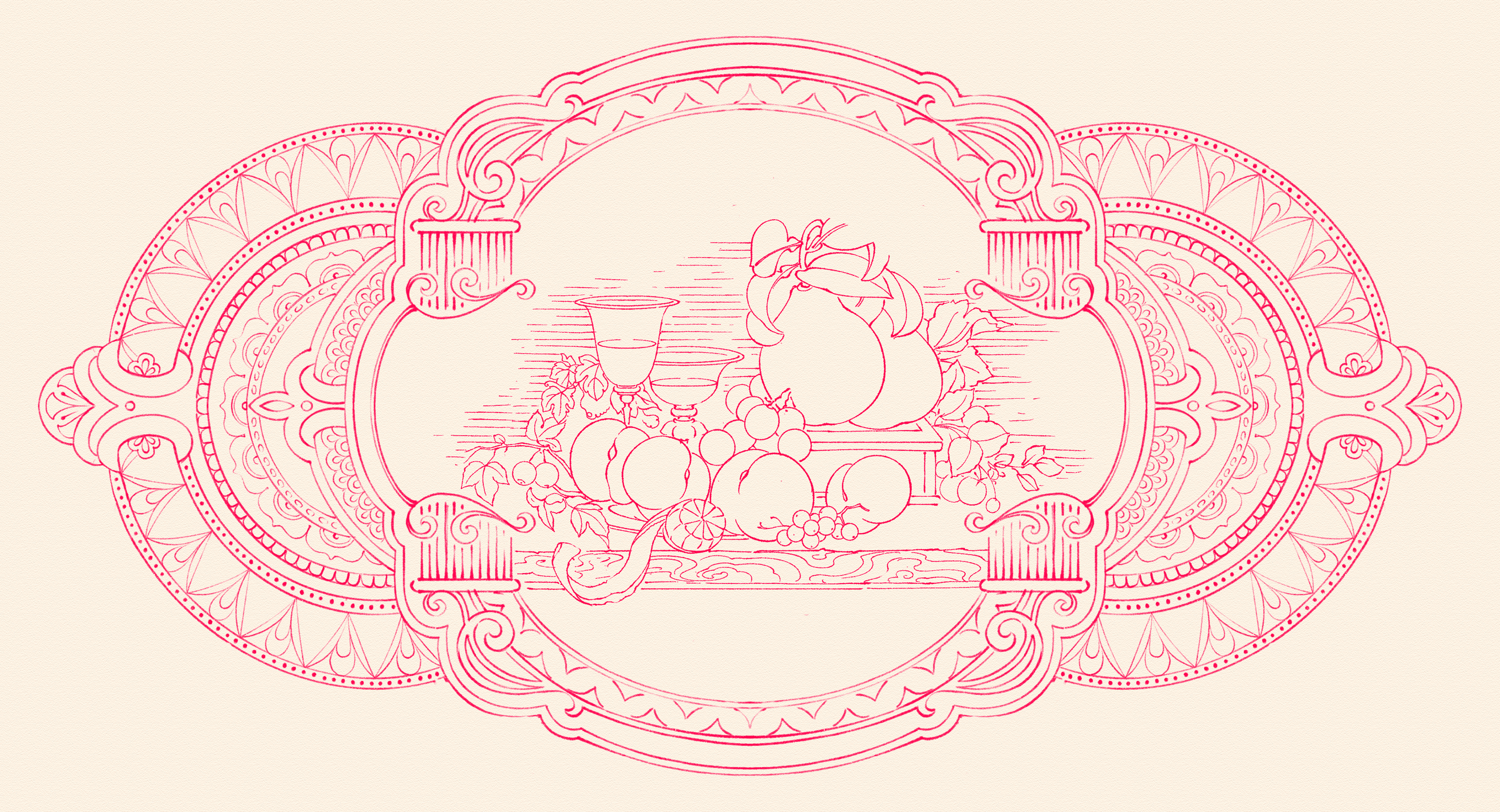 By intertwining three distinct yet interconnected art movements—Baroque, Rococo, and Victorian—this design reaches a new height of sophistication. Grand oval frames, majestic pillars, and sweeping curves (Baroque) provide the structural skeleton for the intricate ornamentation of flora and fauna (Rococo), all executed through the unique engraving techniques of 19th-century Victorian England. This refined fusion evokes the heady aroma of vintage cognac and the ceremonial luxury found in the private salons of the aristocracy.