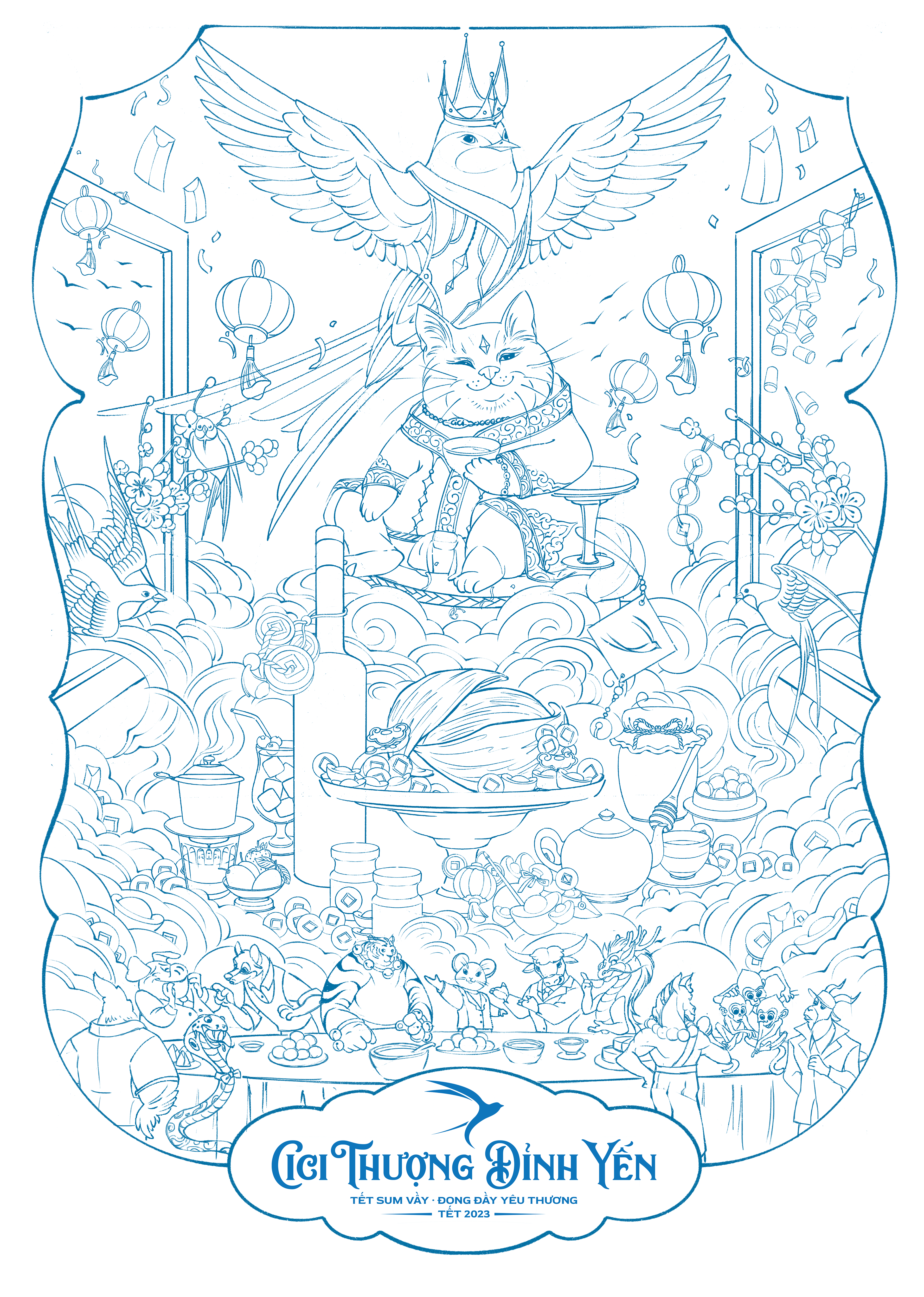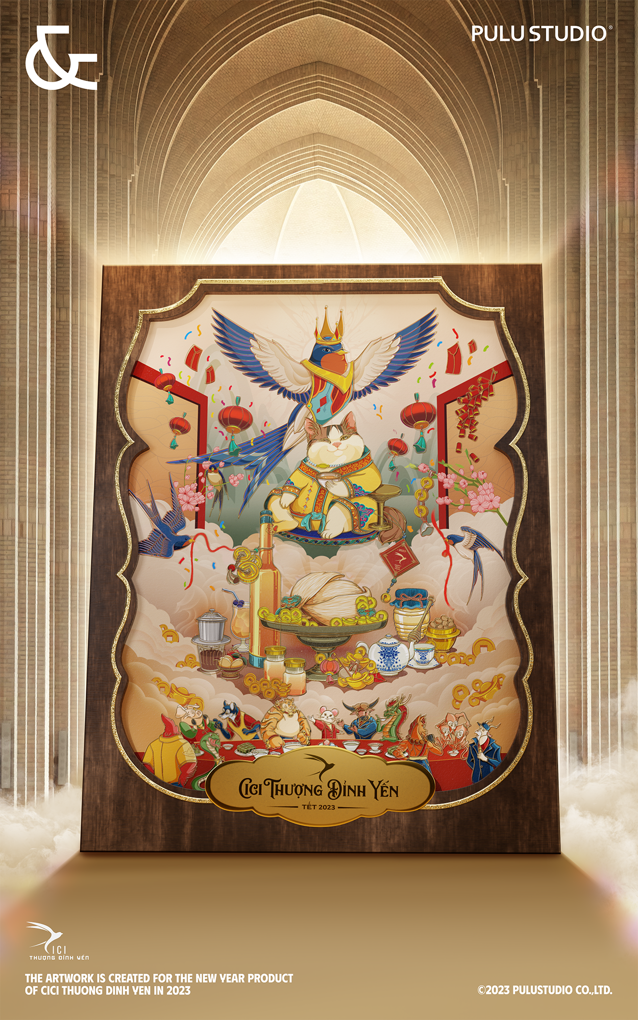 Ngoc Yen Kim Mieu is an artwork that recreates the magnificent party organized by Quy Mao to treat the other zodiacs with nutritious food and drinks provided by Ngoc Yen who is the representative of Cici Thuong Dinh Yen.