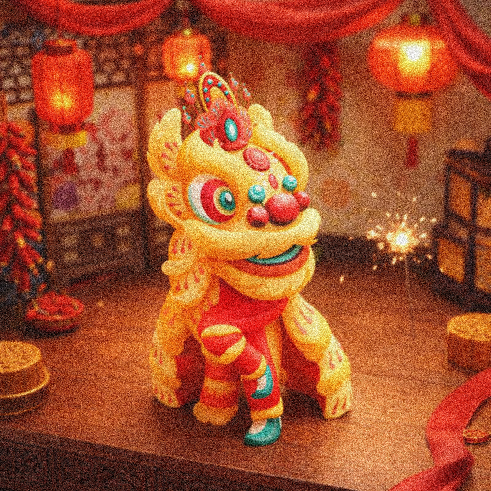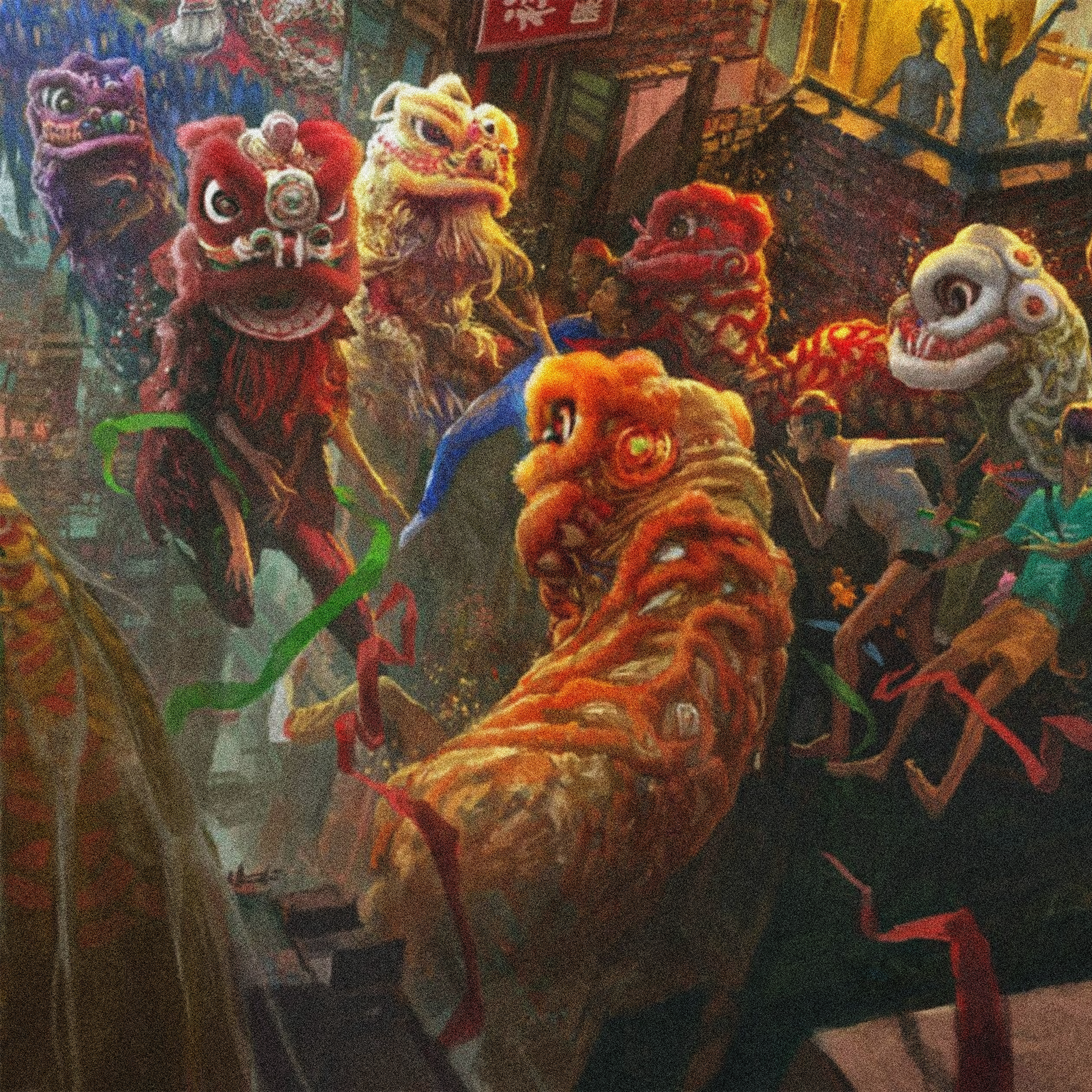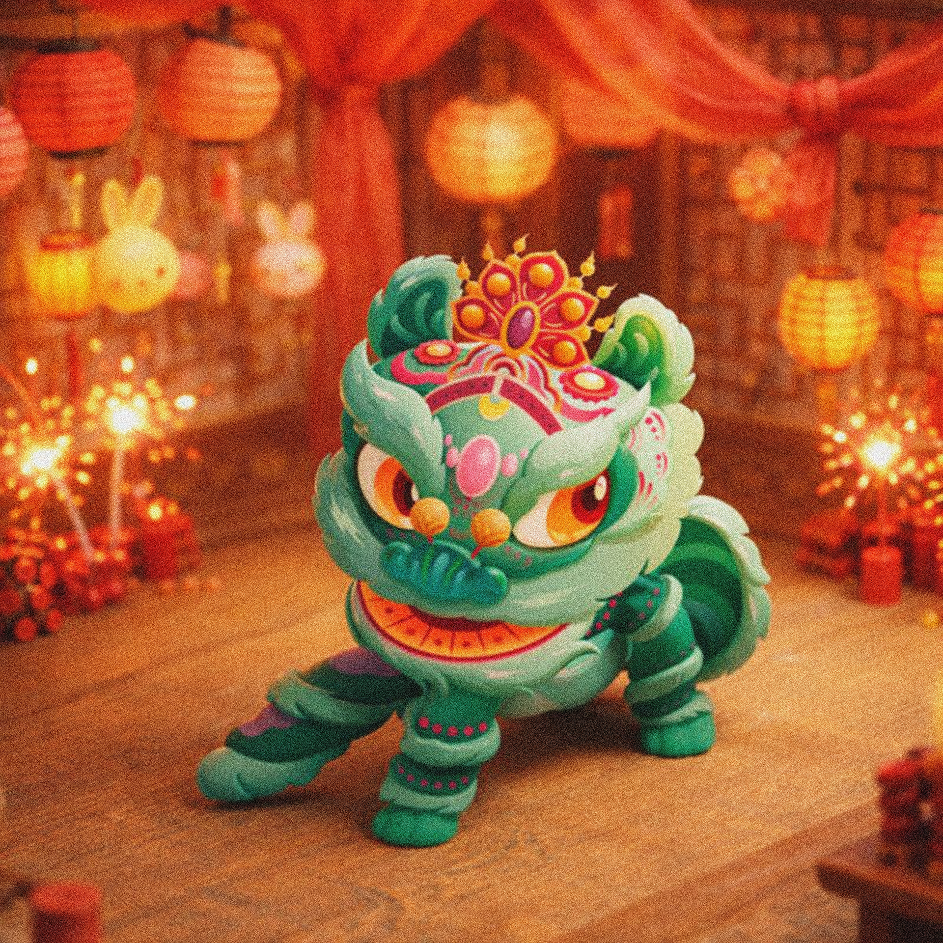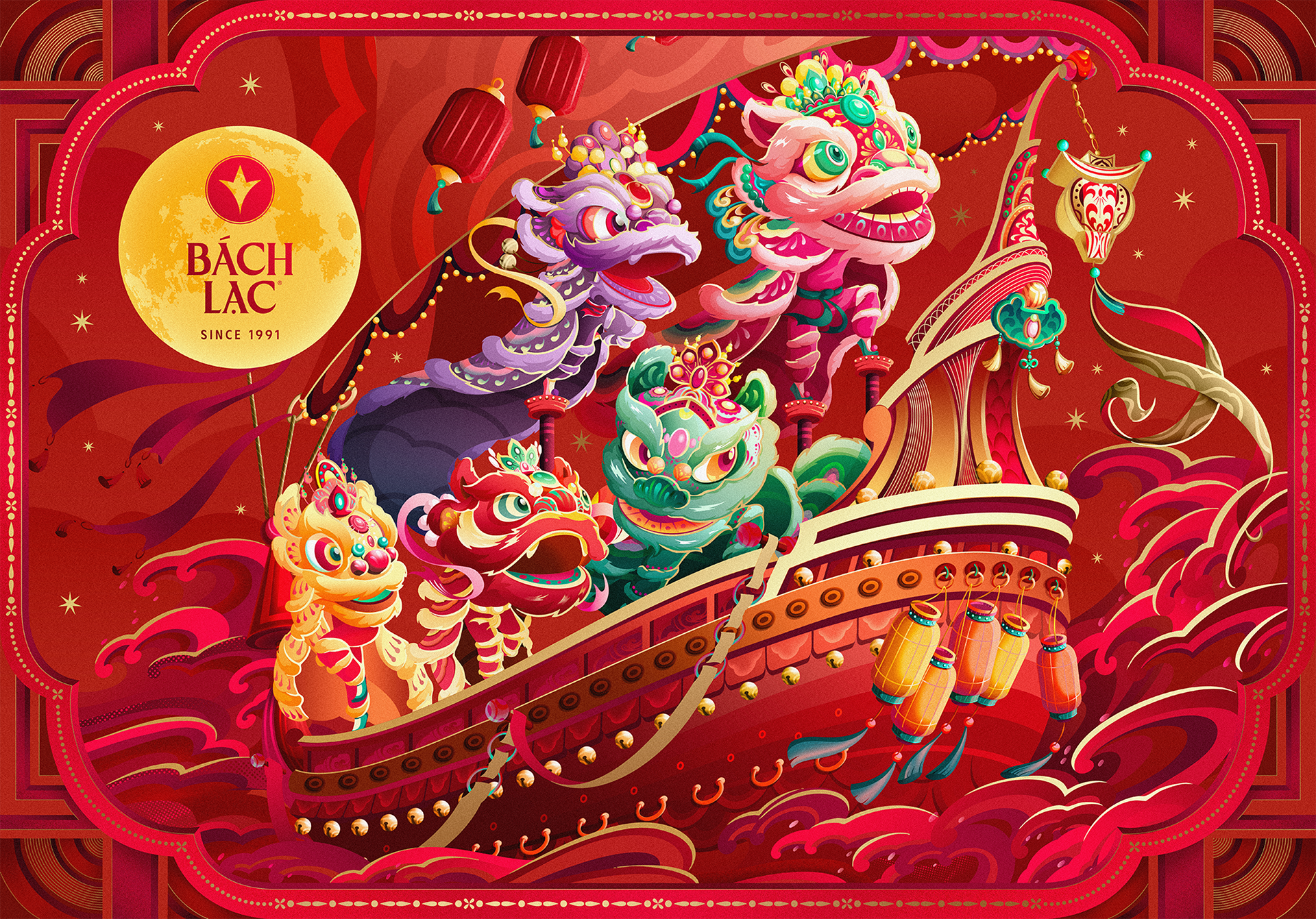 The Five Lions, poised upon a festival vessel, sweep across the waves with hearts alight in joyful anticipation. The design brimming with life and motion, it gently stirs the senses — allowing the festive rhythm and uplifting spirit to be felt at first sight, like the echo of celebration carried on the wind.